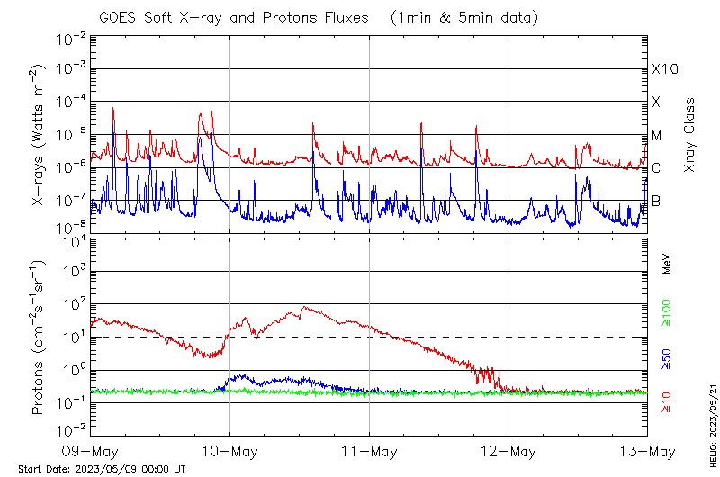 This page provides light-curves generated from GOES soft X-ray and Particle data for the date indicated at the top and the preceding three days.