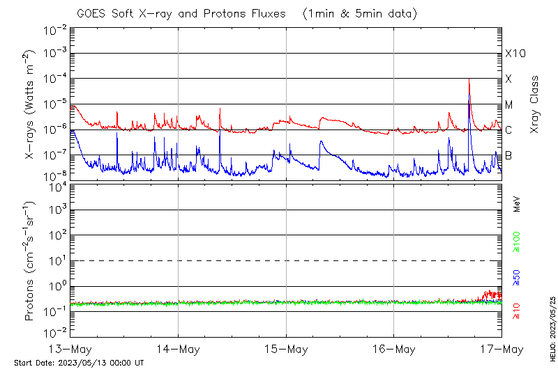 This page provides light-curves generated from GOES soft X-ray and Particle data for the date indicated at the top and the preceding three days.