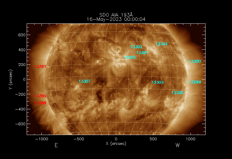 Click on an Active Region plot to display the Region Report including the region evolution and flaring history. HEC Search for NOAA Active Regions (SRS) records for this date and the day before.