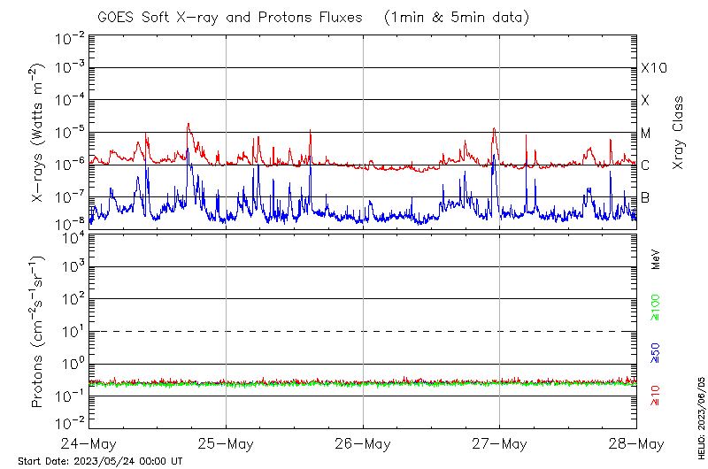 This page provides light-curves generated from GOES soft X-ray and Particle data for the date indicated at the top and the preceding three days.