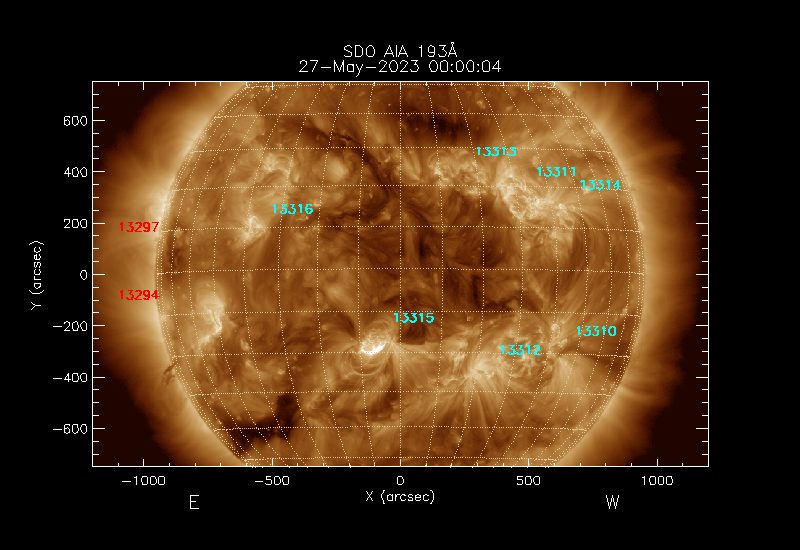 Click on an Active Region plot to display the Region Report including the region evolution and flaring history. HEC Search for NOAA Active Regions (SRS) records for this date and the day before.