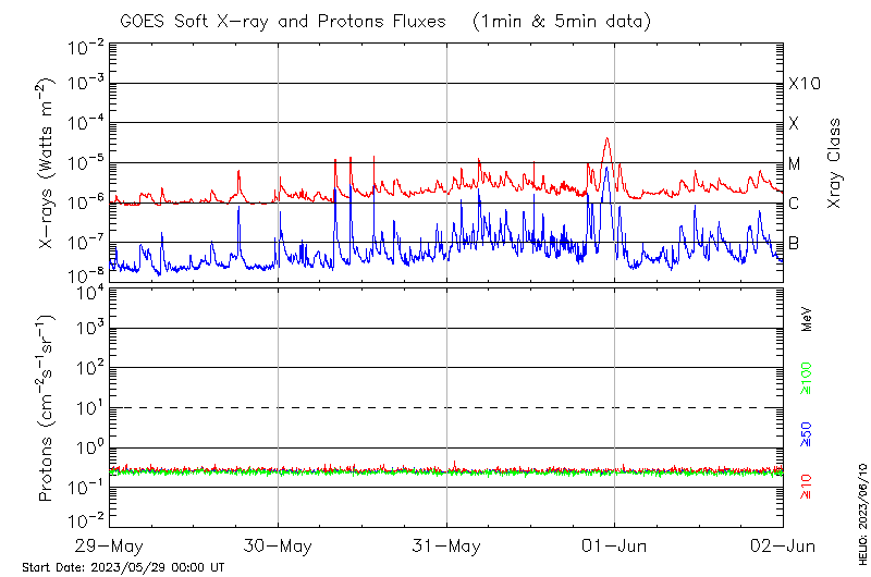 This page provides light-curves generated from GOES soft X-ray and Particle data for the date indicated at the top and the preceding three days.