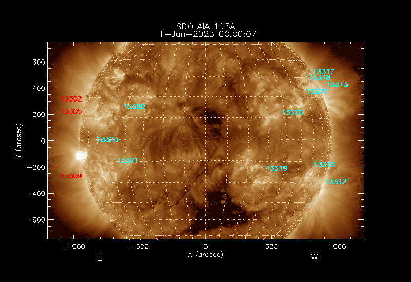 Click on an Active Region plot to display the Region Report including the region evolution and flaring history. HEC Search for NOAA Active Regions (SRS) records for this date and the day before.