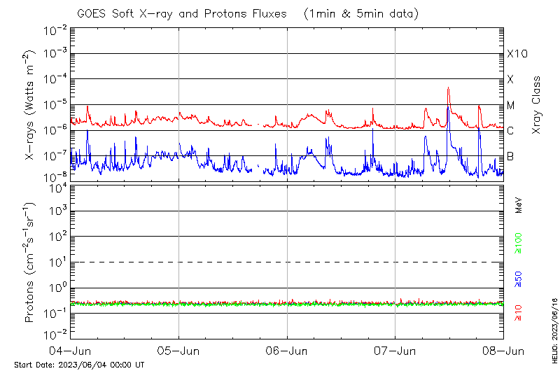 This page provides light-curves generated from GOES soft X-ray and Particle data for the date indicated at the top and the preceding three days.