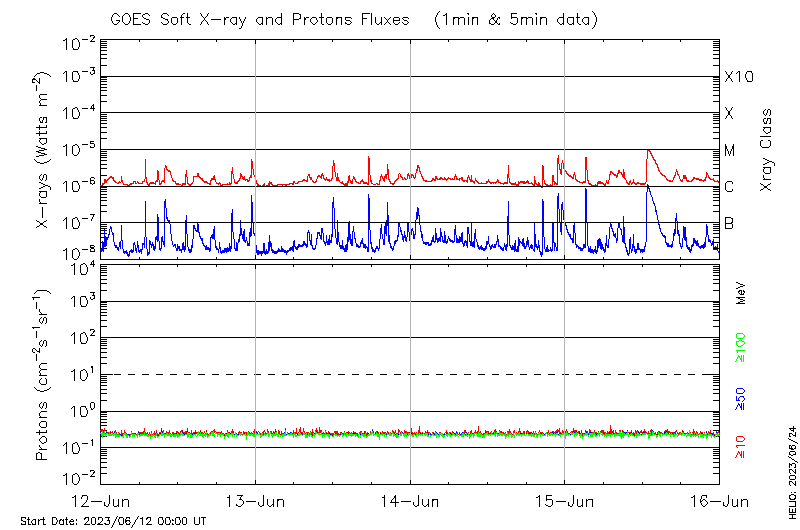 This page provides light-curves generated from GOES soft X-ray and Particle data for the date indicated at the top and the preceding three days.