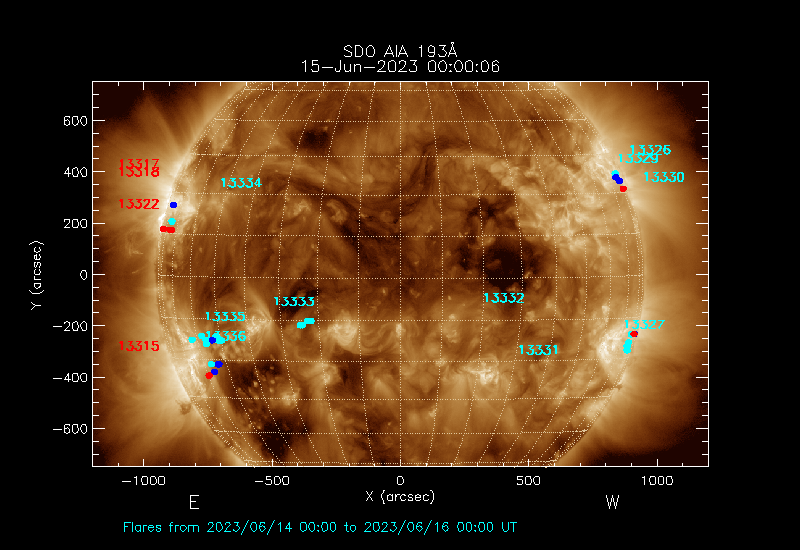 The most recent flares (≤12 hours) are shown as red dots, 12-24 hours ago as blue dots and older ones as turquoise dots.