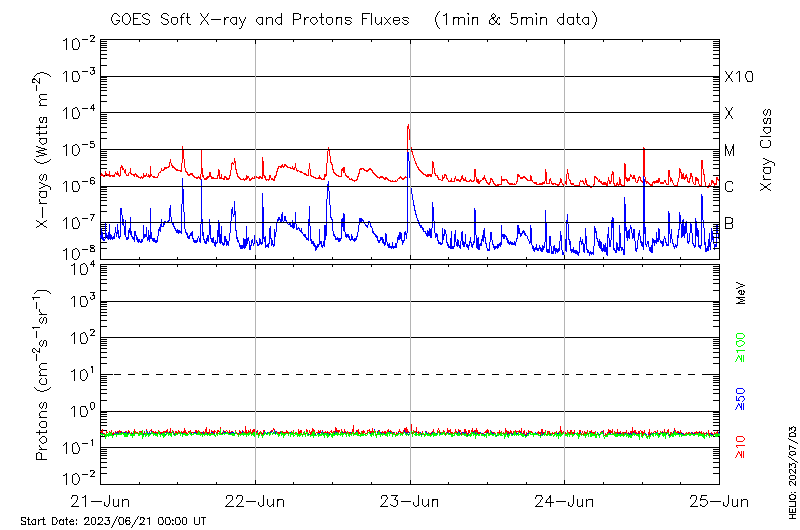This page provides light-curves generated from GOES soft X-ray and Particle data for the date indicated at the top and the preceding three days.