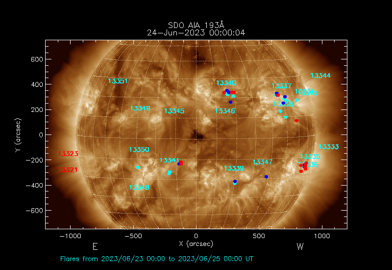 The most recent flares (≤12 hours) are shown as red dots, 12-24 hours ago as blue dots and older ones as turquoise dots.