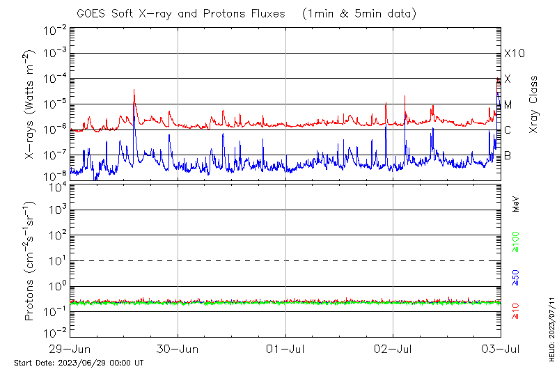 This page provides light-curves generated from GOES soft X-ray and Particle data for the date indicated at the top and the preceding three days.