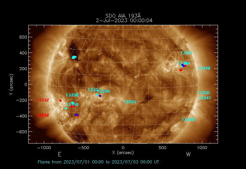 The locations of the flares over-plotted on the image are derived from the flare catalogue
