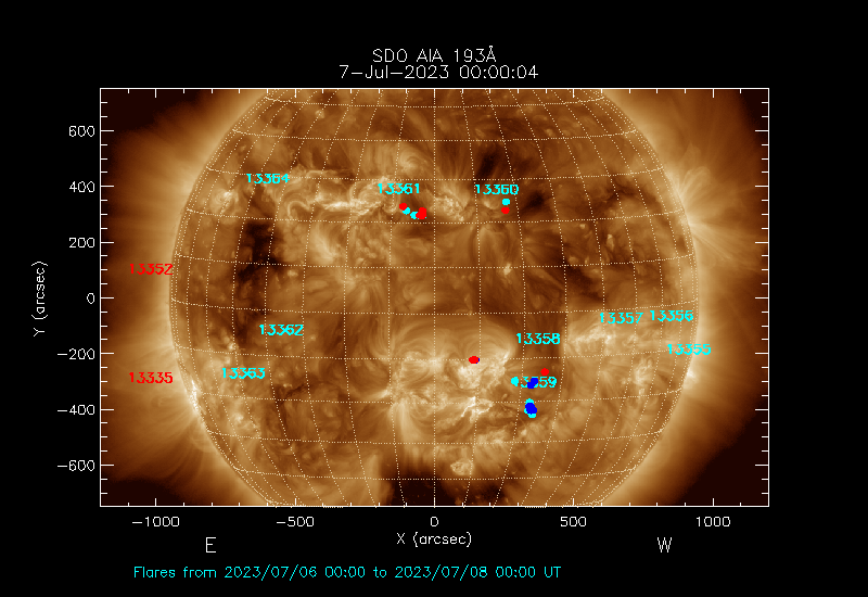 The locations of the flares over-plotted on the image are derived from the flare catalogue