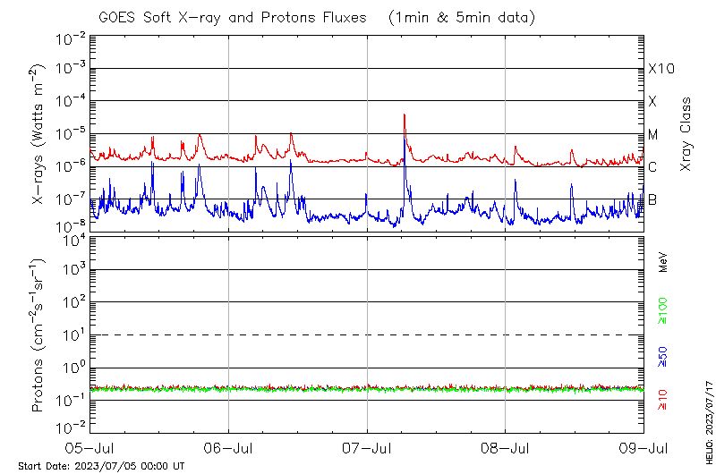 This page provides light-curves generated from GOES soft X-ray and Particle data for the date indicated at the top and the preceding three days.