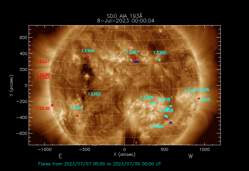 The locations of the flares over-plotted on the image are derived from the flare catalogue