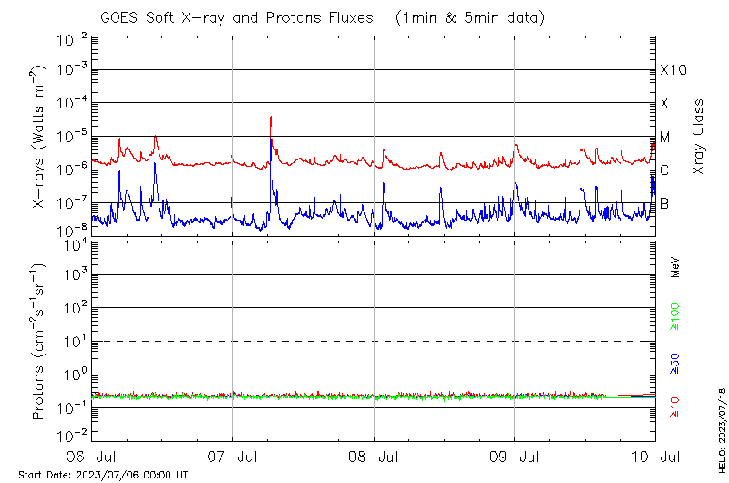 This page provides light-curves generated from GOES soft X-ray and Particle data for the date indicated at the top and the preceding three days.