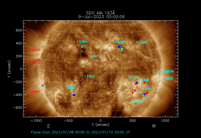 The locations of the flares over-plotted on the image are derived from the flare catalogue