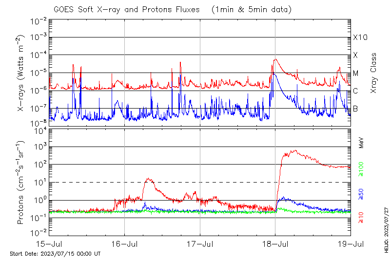 This page provides light-curves generated from GOES soft X-ray and Particle data for the date indicated at the top and the preceding three days.