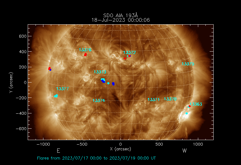 The most recent flares (≤12 hours) are shown as red dots, 12-24 hours ago as blue dots and older ones as turquoise dots.