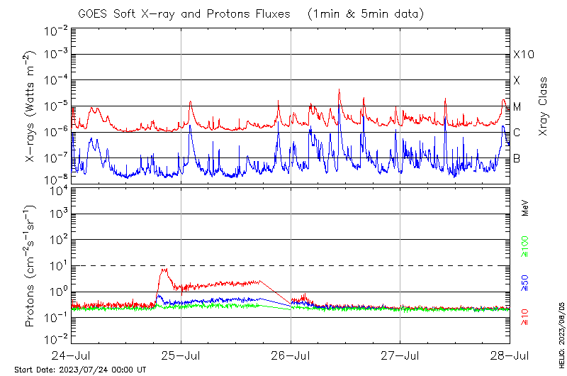 This page provides light-curves generated from GOES soft X-ray and Particle data for the date indicated at the top and the preceding three days.
