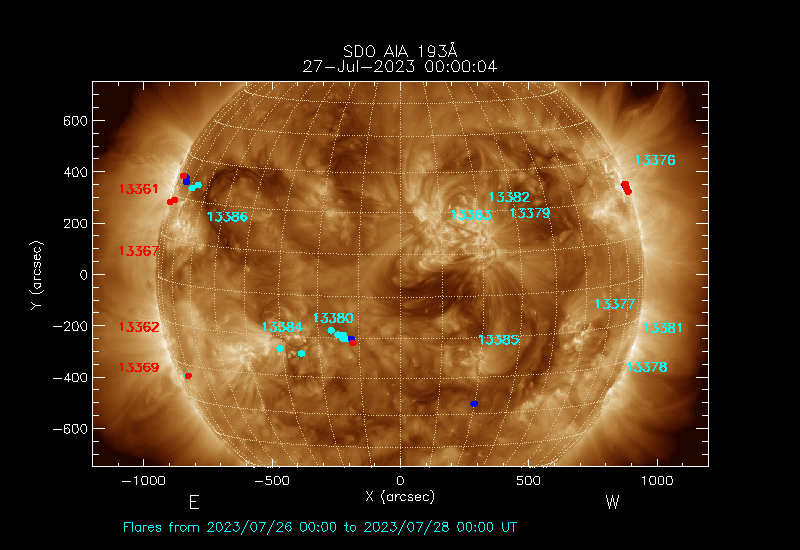 The most recent flares (≤12 hours) are shown as red dots, 12-24 hours ago as blue dots and older ones as turquoise dots.