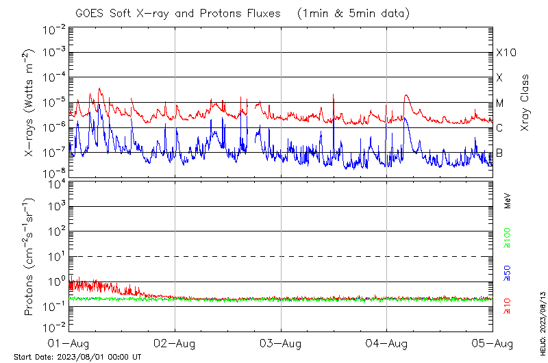 This page provides light-curves generated from GOES soft X-ray and Particle data for the date indicated at the top and the preceding three days.