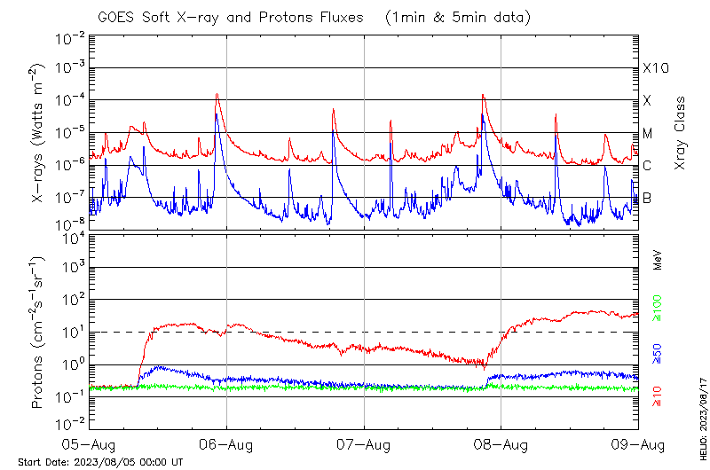 This page provides light-curves generated from GOES soft X-ray and Particle data for the date indicated at the top and the preceding three days.