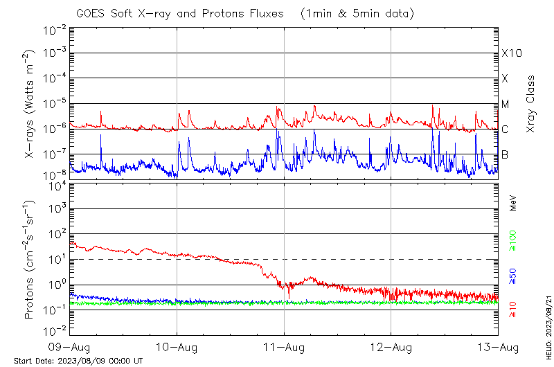 This page provides light-curves generated from GOES soft X-ray and Particle data for the date indicated at the top and the preceding three days.