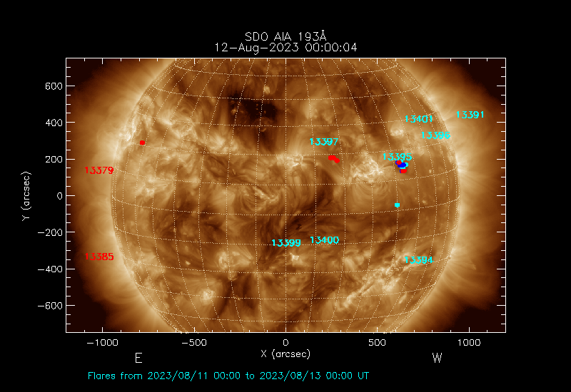 The most recent flares (≤12 hours) are shown as red dots, 12-24 hours as blue