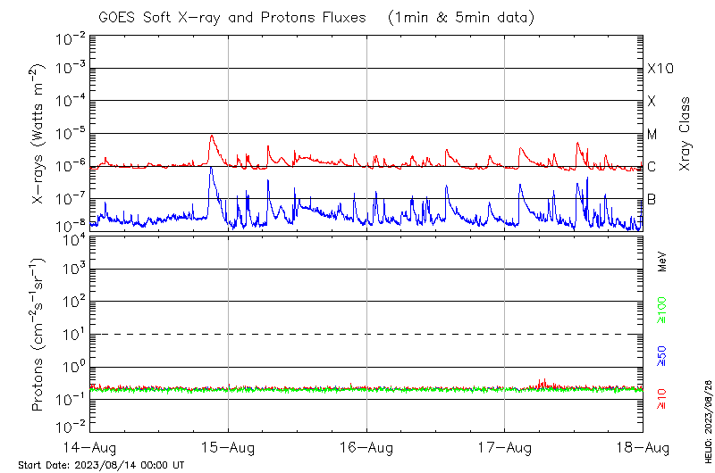 This page provides light-curves generated from GOES soft X-ray and Particle data for the date indicated at the top and the preceding three days.