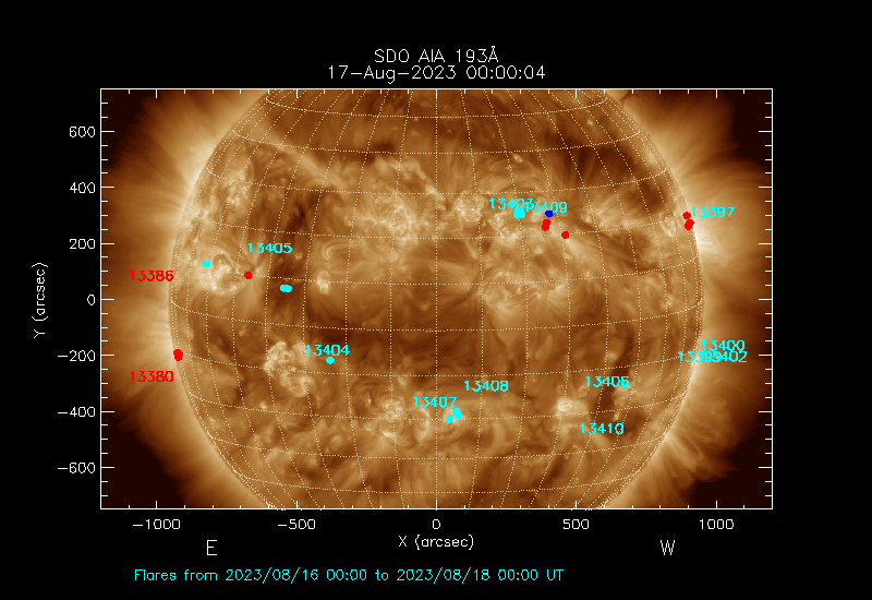 The most recent flares (≤12 hours) are shown as red dots, 12-24 hours ago as blue dots and older ones as turquoise dots.