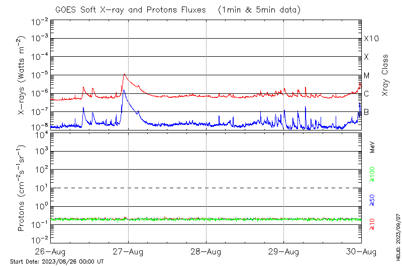 This page provides light-curves generated from GOES soft X-ray and Particle data for the date indicated at the top and the preceding three days.