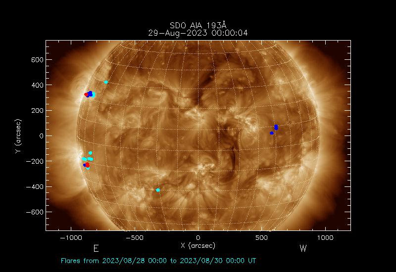 The most recent flares (≤12 hours) are shown as red dots, 12-24 hours ago as blue dots and older ones as turquoise dots.