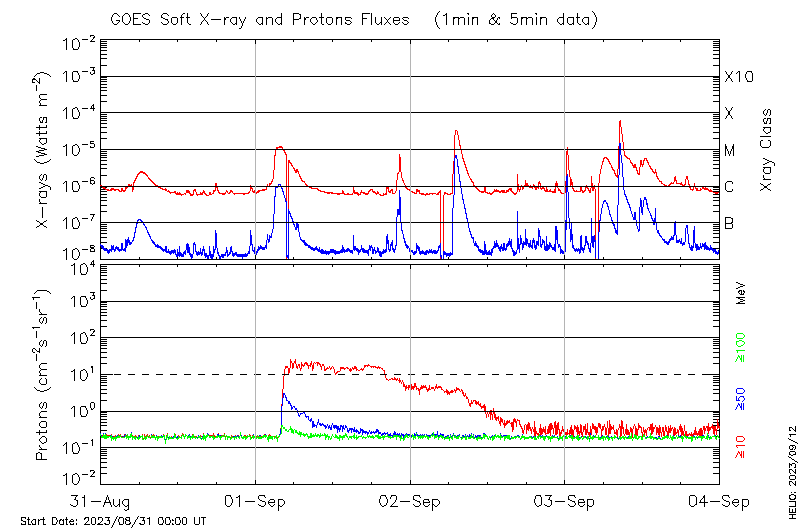 This page provides light-curves generated from GOES soft X-ray and Particle data for the date indicated at the top and the preceding three days.