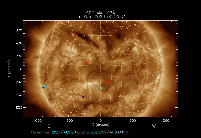 The most recent flares (≤12 hours) are shown as red dots, 12-24 hours ago as blue dots and older ones as turquoise dots.
