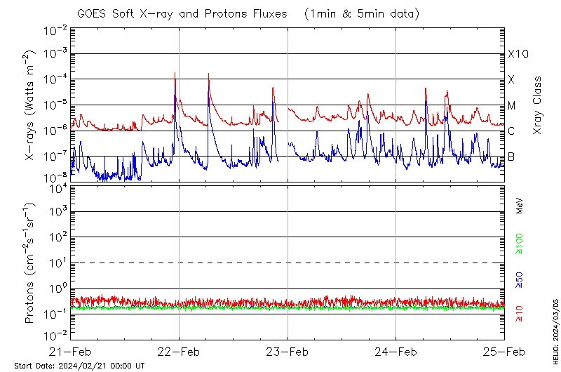 This page provides light-curves generated from GOES soft X-ray and Particle data for the date indicated at the top and the preceding three days.