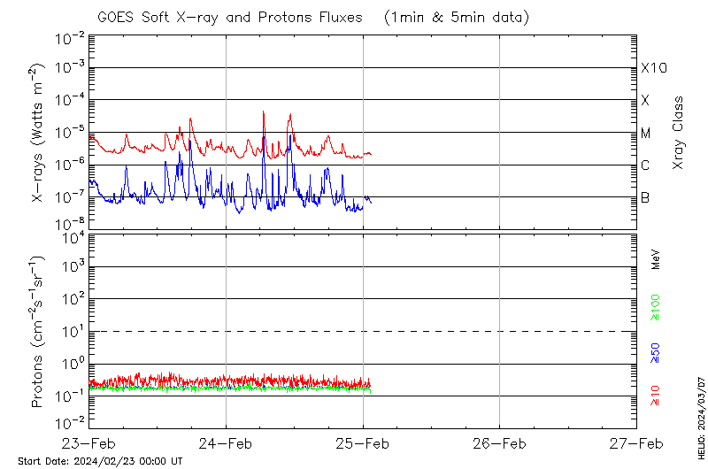 This page provides light-curves generated from GOES soft X-ray and Particle data for the date indicated at the top and the preceding three days.