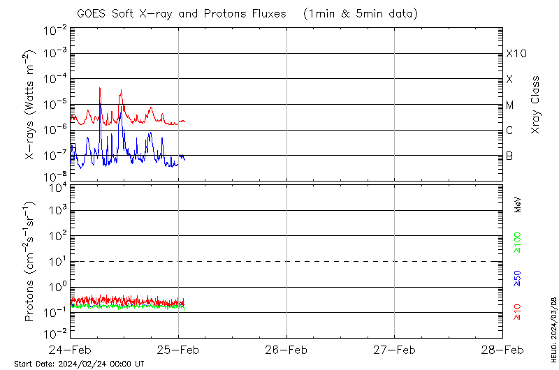 This page provides light-curves generated from GOES soft X-ray and Particle data for the date indicated at the top and the preceding three days.