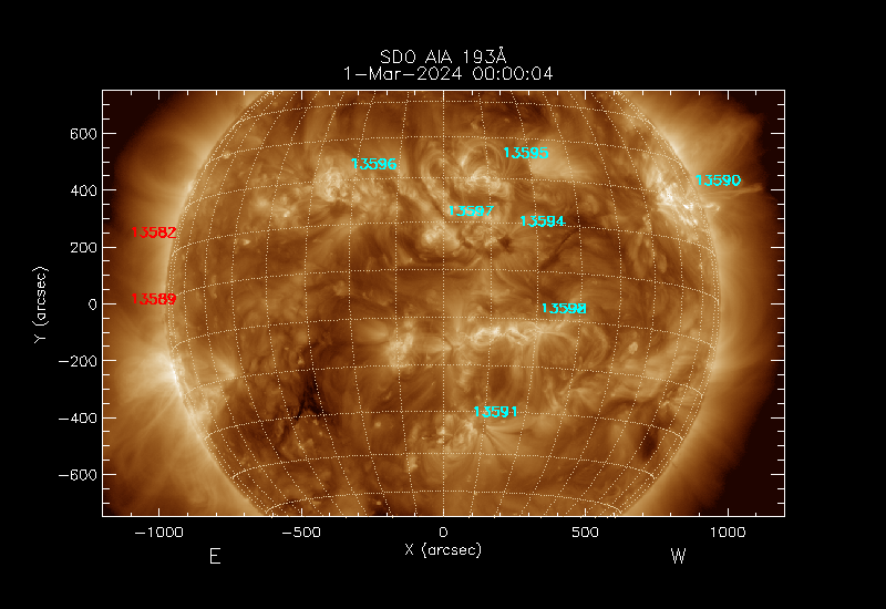 Click on an Active Region plot to display the Region Report including the region evolution and flaring history. HEC Search for NOAA Active Regions (SRS) records for this date and the day before.