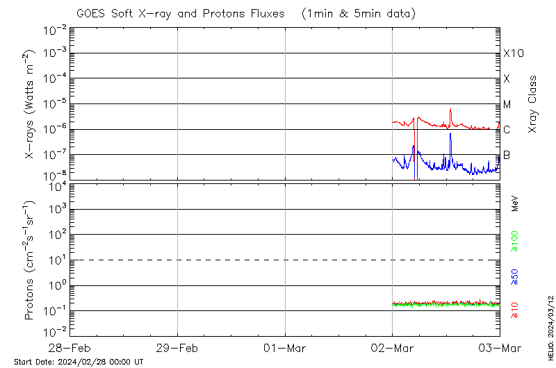 This page provides light-curves generated from GOES soft X-ray and Particle data for the date indicated at the top and the preceding three days.