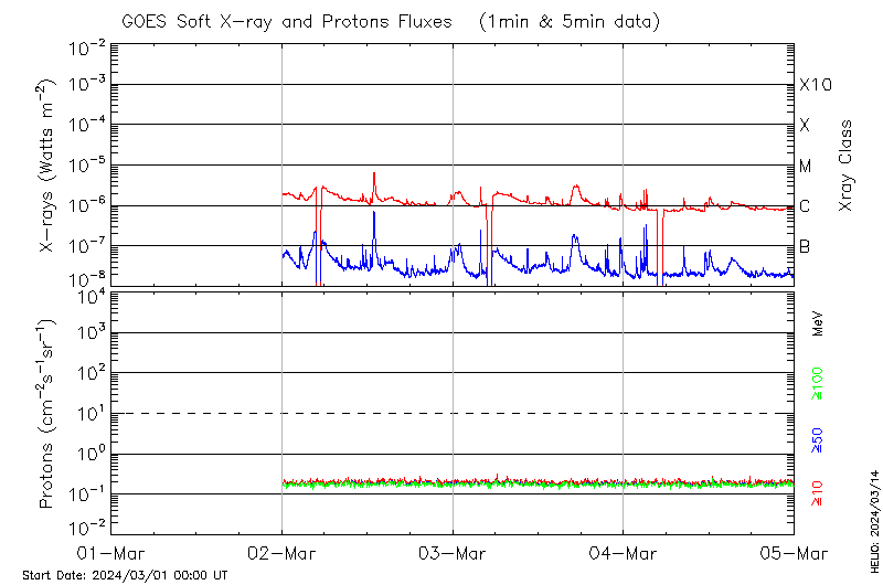 This page provides light-curves generated from GOES soft X-ray and Particle data for the date indicated at the top and the preceding three days.