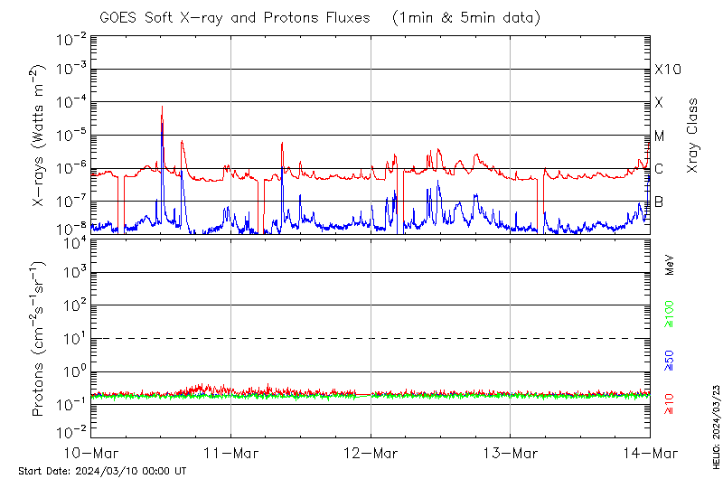 This page provides light-curves generated from GOES soft X-ray and Particle data for the date indicated at the top and the preceding three days.