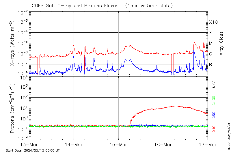 This page provides light-curves generated from GOES soft X-ray and Particle data for the date indicated at the top and the preceding three days.