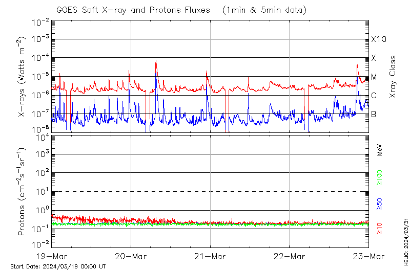 This page provides light-curves generated from GOES soft X-ray and Particle data for the date indicated at the top and the preceding three days.