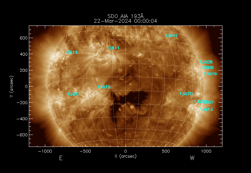 Click on an Active Region plot to display the Region Report including the region evolution and flaring history. HEC Search for NOAA Active Regions (SRS) records for this date and the day before.