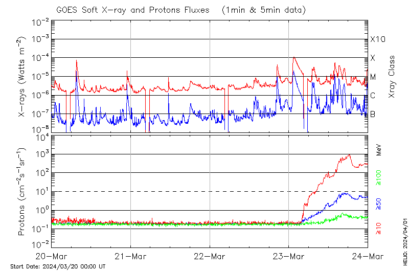 This page provides light-curves generated from GOES soft X-ray and Particle data for the date indicated at the top and the preceding three days.