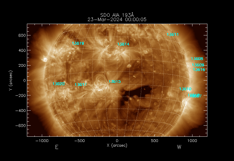 Click on an Active Region plot to display the Region Report including the region evolution and flaring history. HEC Search for NOAA Active Regions (SRS) records for this date and the day before.