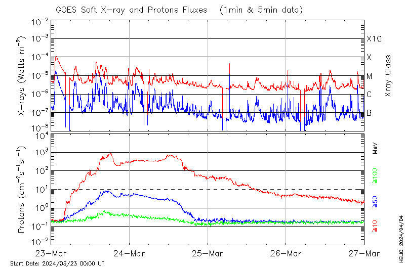 This page provides light-curves generated from GOES soft X-ray and Particle data for the date indicated at the top and the preceding three days.