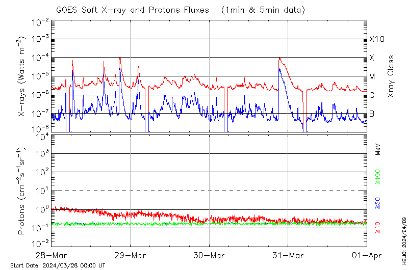 This page provides light-curves generated from GOES soft X-ray and Particle data for the date indicated at the top and the preceding three days.