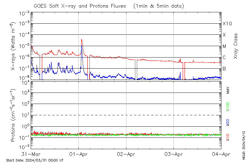 This page provides light-curves generated from GOES soft X-ray and Particle data for the date indicated at the top and the preceding three days.