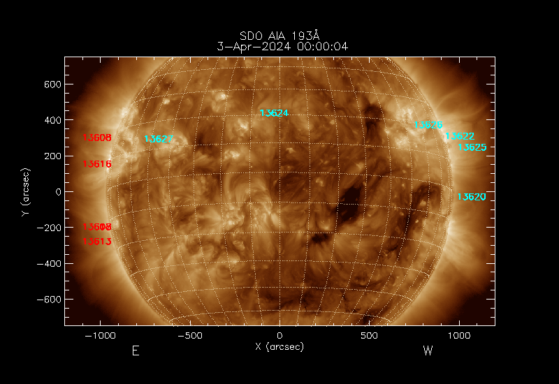 those in red (on the left hand side of the image) indicate where old Active Regions that could be returning.