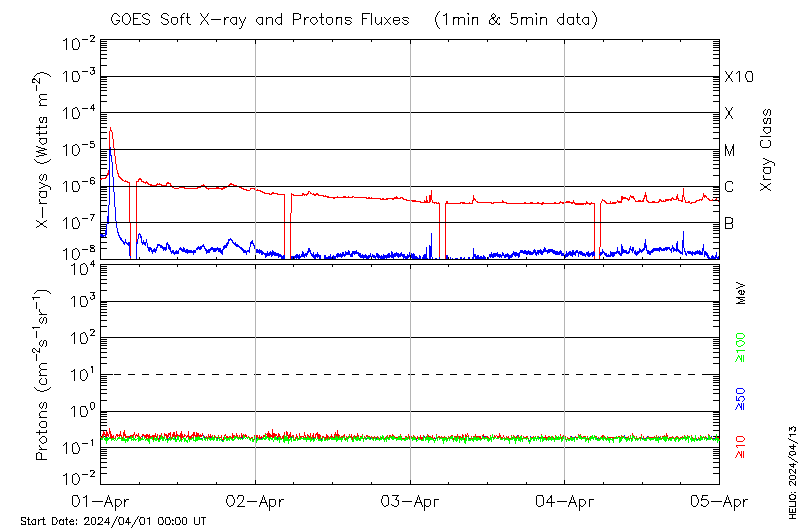 This page provides light-curves generated from GOES soft X-ray and Particle data for the date indicated at the top and the preceding three days.